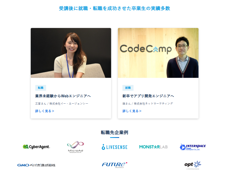 - CodeCamp GATE(現・エンジニア転職コース)経由で、IT企業や自社開発企業に内定した事例が多数。