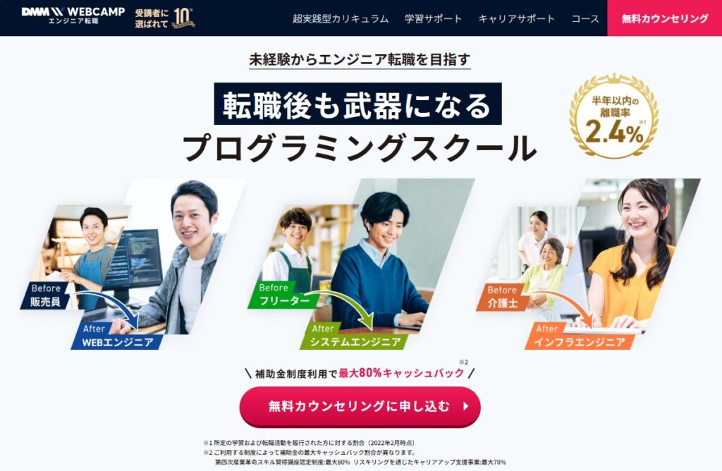 DMM WEBCAMPは、未経験者からでもITエンジニアを目指せるように設計されたプログラミングスクールです。DMMグループが運営しており、短期集中型の学習とキャリア支援に強みがあります。